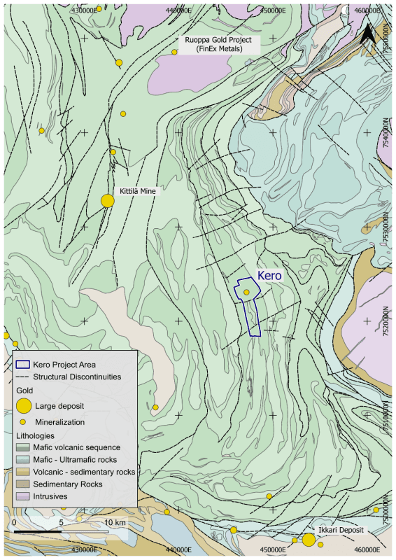 Figure 2. Geological and structural setting of the Kero gold project. Kittilä (Agnico Eagle), Ikkari (Rupert Resources) and Ruoppa (FinEx Metals) gold projects shown for reference1. Map includes mineral occurrence data from the Geological Survey of Finland.