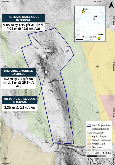 Figure 3. Kero Project area map with select historic GTK drill intervals and channel samples highlighted. Map includes data from the Geological Survey of Finland and from TUKES.