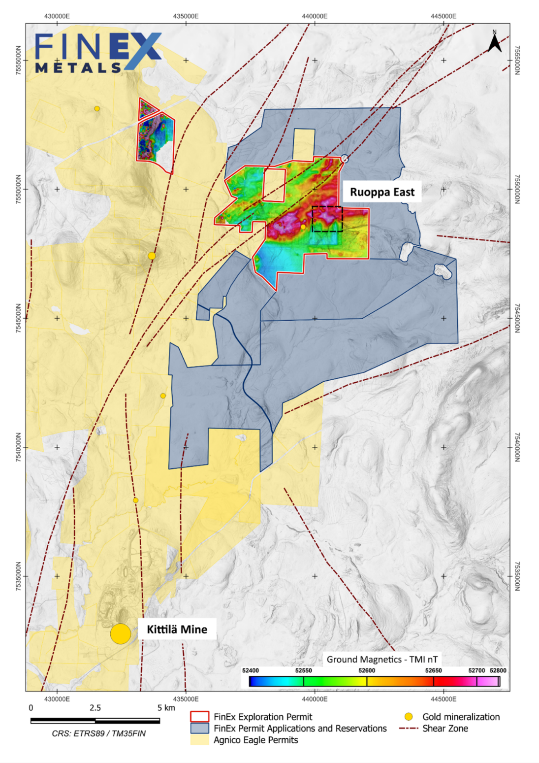 The Company's flagship Ruoppa project is situated in the Central Lapland Greenstone Belt in Finland, adjoining Agnico Eagle's Kittilä mine land position, the largest gold mine in Europe, and in proximity to the land position that hosts Rupert Resources' recent Ikkari discovery.  Previous work by FinEx identified a series of gold targets that extend over approximately 2.7 km.  For more information on the Ruoppa project, refer to the NI 43-101 Technical Report dated April 14, 2025, as filed on SEDAR+ at www.sedarplus.ca.