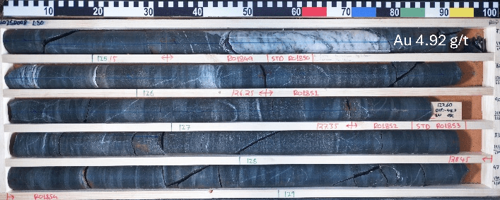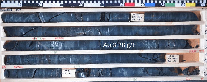 Figure 5: Photos of drill core from hole RUO25D008, including sample intervals 113.00-114.65 m grading 3.26 g/t Au and 125.15-126.25m grading 4.92 g/t Au. Red marks show the sample intervals.