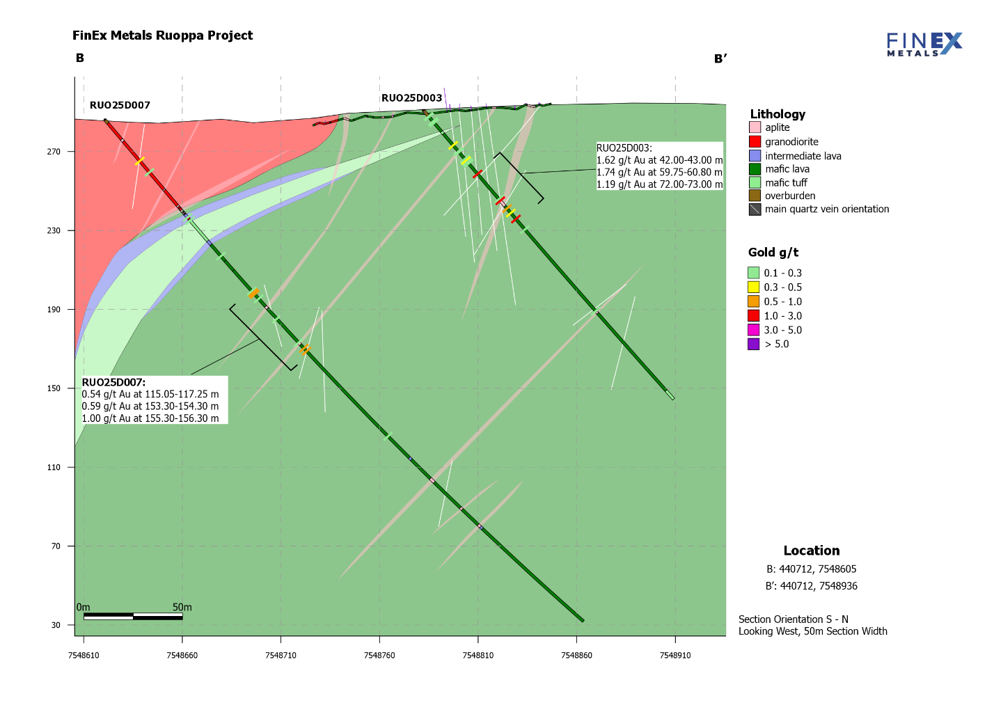 The rationale for locating the five first reported holes RUO25D001, 002, 003, 009 and 010 was described in FinEx press release dated November 25, 2025. The remaining drill holes were collared to expand the known mineralization towards the south and west. Drill holes RUO25D005 to RUO25D008 tested the contact zone between the volcanics and granodiorite intrusion as well as the vertical continuation of gold bearing quartz veins at depth under trenches RUO24T1 and RUO24T2. Drill holes RUO25D004 and RUO25D012 tested the continuation of east-west striking gold bearing quartz-carbonate veins under trenches RUO24T1 and RUO24T2. Drill holes RUO25D013 and RUO25D014 were step outs. RUO25D014 was situated 420 metres west of drill hole RUO25D001.