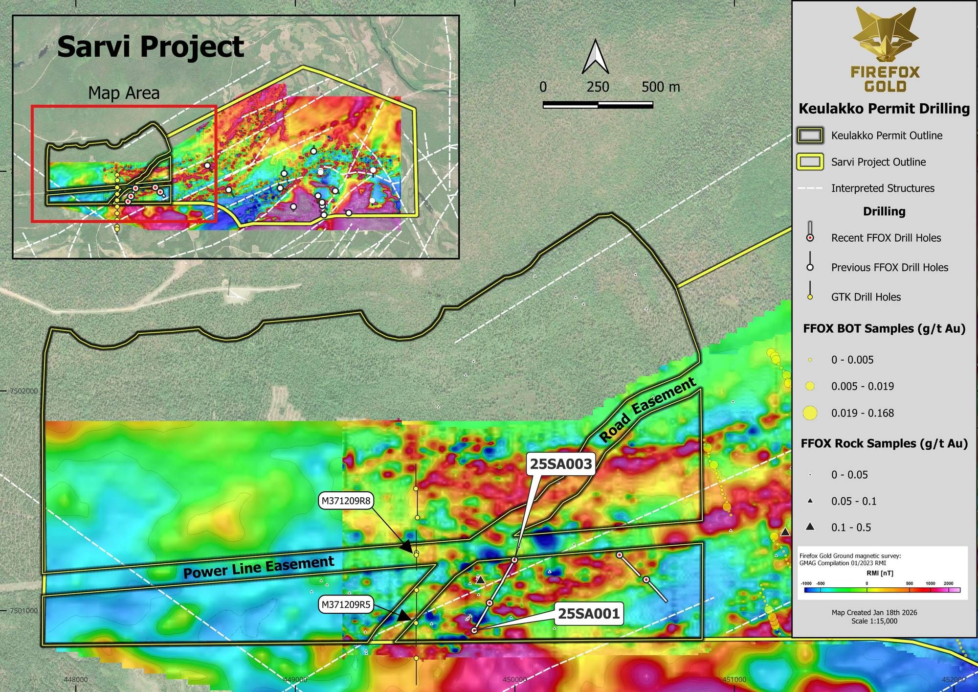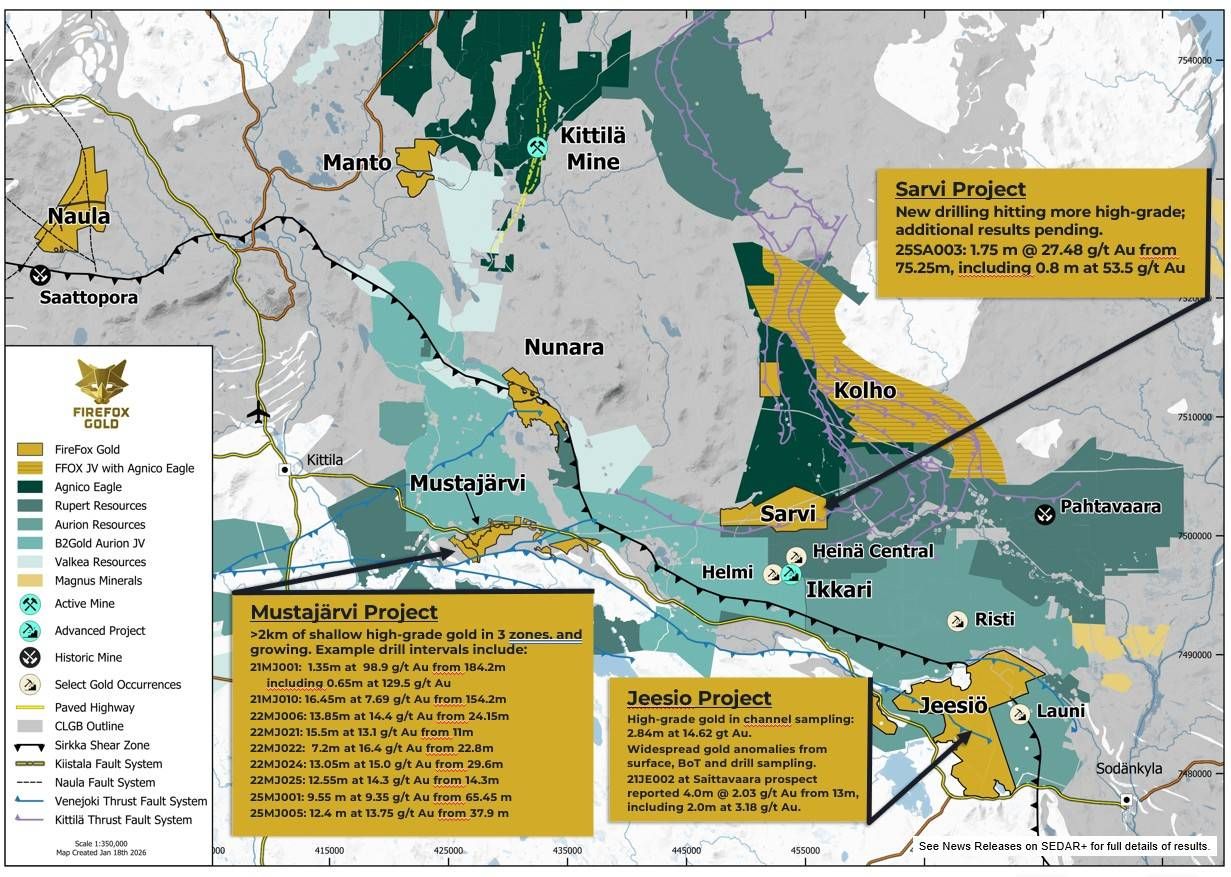 SODANKYLĂ„, FINLAND / ACCESS Newswire / January 21, 2026 / FireFox Gold Corp. (TSXV:FFOX,OTC:FFOXF)(OTCQB:FFOXF)("FireFox" or the "Company") is pleased to report the first results from 2025 drilling into a new target at the western end of the Company's 100%-held Sarvi gold project ("Sarvi") in Lapland, Finland. Drill hole 25SA003 encountered a high-grade gold zone of 1.75 metres averaging 27.48 g/t, including 0.8 metres at 53.50 g/t gold, from 73.4 metres downhole depth. The target concept for this small reconnaissance drill program was to examine interpreted regional scale structures cutting through discrete magnetic highs and magnetic gradients (transitions from highly magnetic to less magnetic rocks). As previously reported, reconnaissance drilling by the Geological Survey of Finland (GTK) nearby encountered narrow intervals of moderate gold grade (See Company news release dated November 18, 2025).