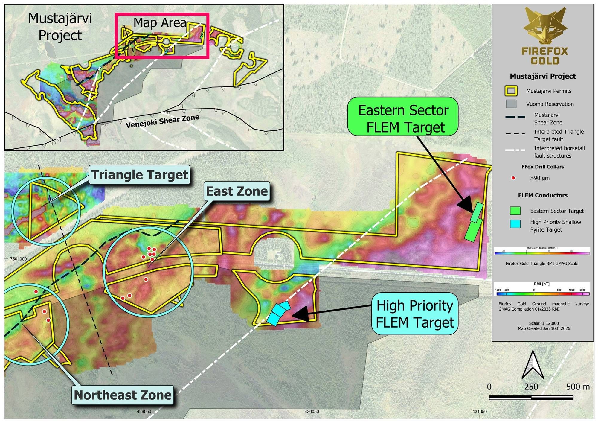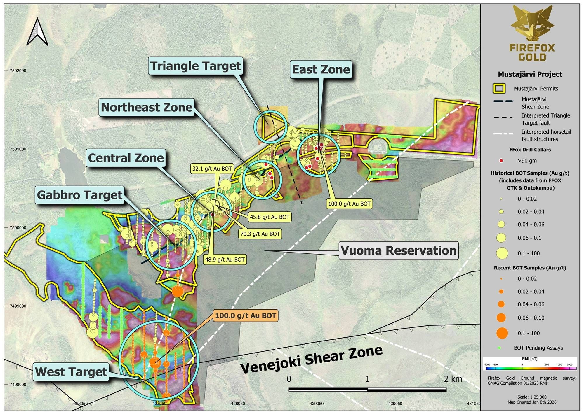 SODANKYLÄ, FINLAND / ACCESS Newswire / January 12, 2026 / FireFox Gold Corp. (TSX.V:FFOX)(OTCQB:FFOXF)("FireFox" or the "Company") is pleased to share an exploration update from its 100%-held Mustajärvi Gold Project in Lapland, Finland. New drill targets have emerged well away from previously reported high-grade drill results in the Northeast and East Zones. The new targets are based on new gold anomalies in base-of-till (BoT) sampling and geophysical anomalies, both of which correlate with attractive structural settings and other favourable indicators. Perhaps most significant, one new BoT sample returned more than 100 g/t gold in an undrilled area near a major structural intersection two kilometres southwest from any previous drilling. FireFox will be targeting this area and the new geophysical anomalies with new drilling as part of its ongoing Mustajärvi drill program.