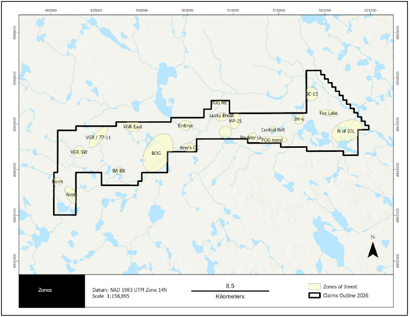 At just over 17,363.60 ha in area, the Yath Project not only hosts the on-trend potential of the Lac 50 historical deposit, but also advanced targets such as the VGR trend, BOG Zone, Fog & IM-6, Embryo, Lucky Break, MP-25, and Boulder Lake. (See Figure 1 below, Known Mineralization).