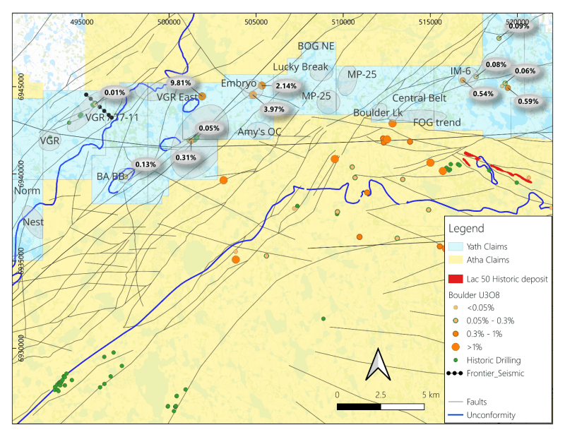 Historic exploration has already identified uranium mineralization within the broader district, including the LAC 50 and RIB deposits located south of Yath. Recent work by neighboring operators has further validated the significance of northeast-trending structures in controlling uranium mineralization.
