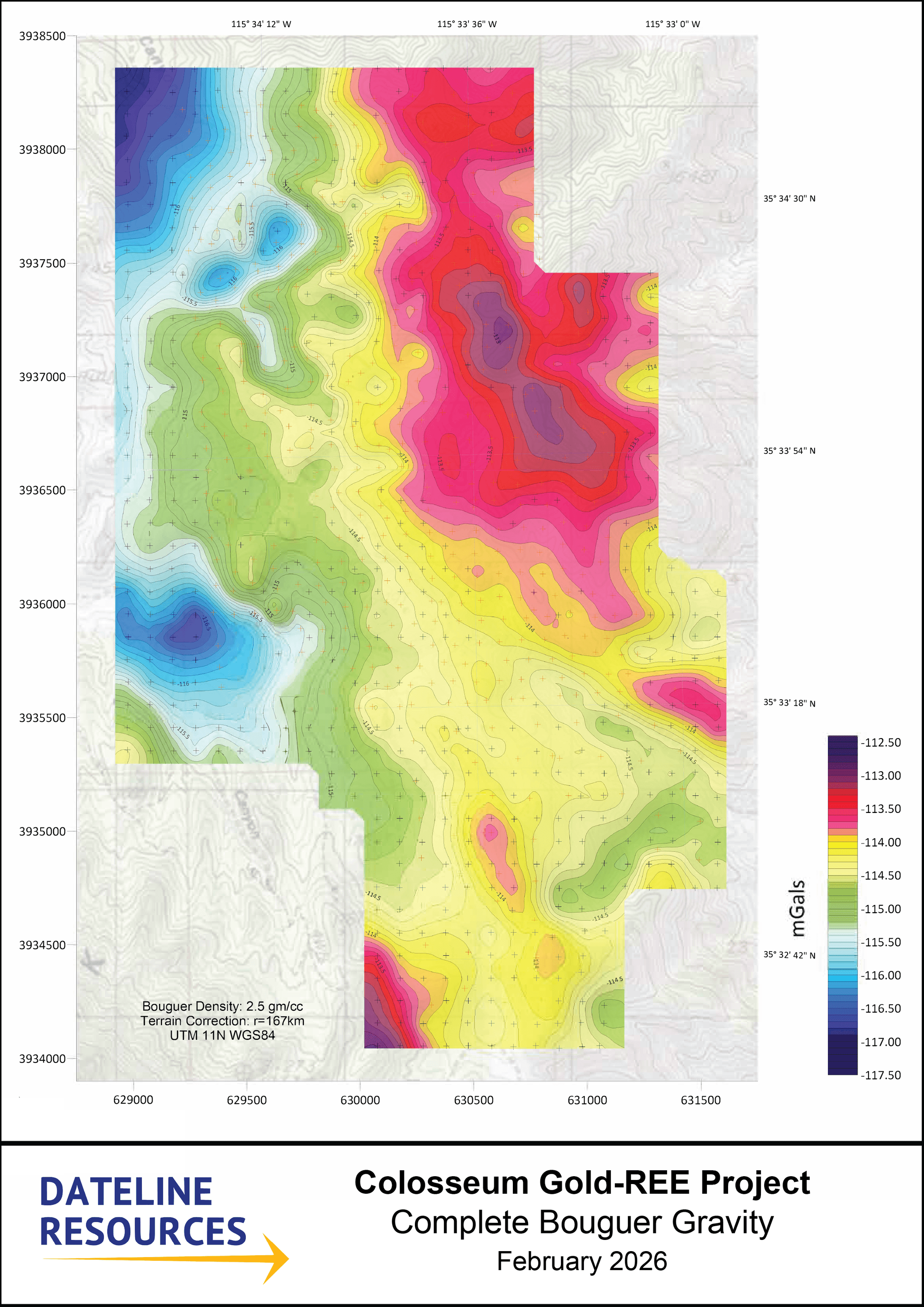 Figure 2: Preliminary Bouguer Gravity from the recently completed survey at Colosseum. The red and pink zones indicate higher density rocks, whilst the green and blues indicate lower density rocks (such as sediments). The strong gravity high on the eastern side points to dense intrusive or altered bodies at depth (alkaline intrusive rocks, breccia pipe roots, or carbonatite related material). There also appears to be a sharp N-S gravity gradient that aligns with the Clark Mountain fault.