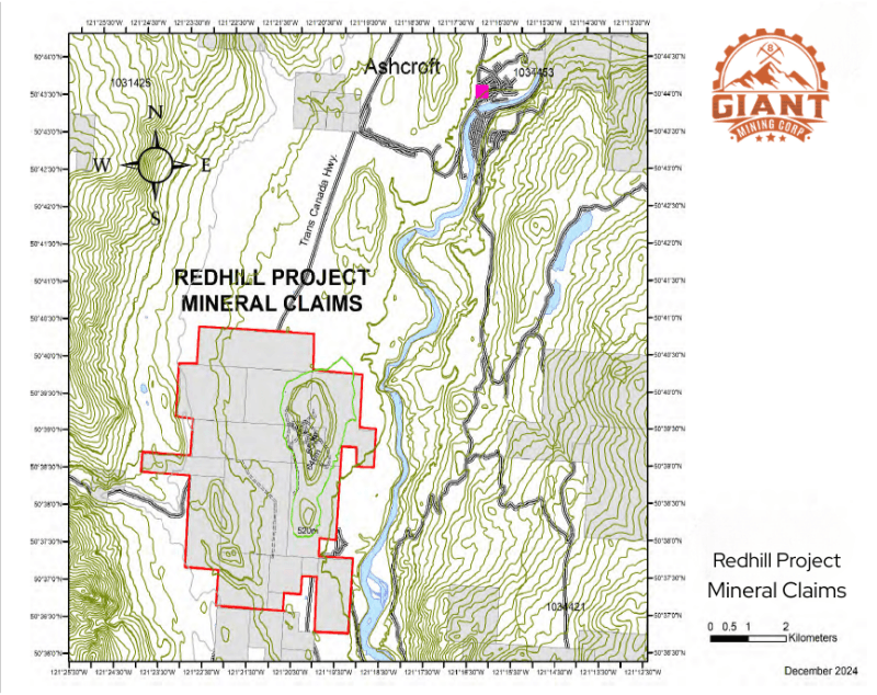 Figure 1: Location and mineral claim boundaries of the Redhill Property near Ashcroft, British Columbia (December 2024). Map illustrates claim extents in relation to local topography and infrastructure.