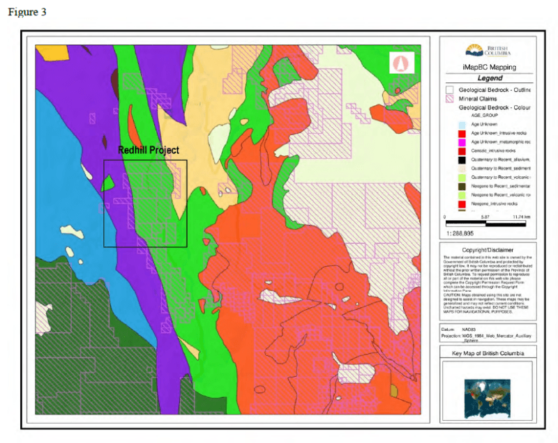 Figure 2: Regional geological map of the Redhill Property, located near Ashcroft, British Columbia, showing mineral claims and surrounding lithological units (source: iMapBC).