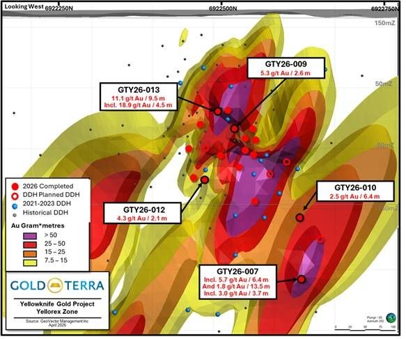 VANCOUVER, BC / ACCESS Newswire / April 14, 2026 / Gold Terra Resource Corp. (TSXV:YGT,OTC:YGTFF)(Frankfurt:TX0)(OTCQB:YGTFF) ("Gold Terra" or the "Company") is pleased to announce assay results from an additional five (5) holes of the 2026 Winter Drill Program targeting the Yellorex zone immediately south of the past producing Campbell Shear (CS), historic Con Mine (1938-2003). The current drilling program aims at confirming some historical holes and to potentially expand Gold Terra's near surface 2022 Mineral Resource Estimate (MRE) on the Con Mine Option property.