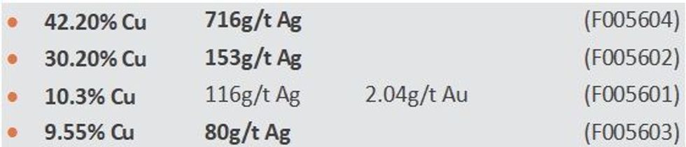 Latest assays include 42.2% Cu, 17.4/t Au and 716g/t Ag. High-grade precious and base metal occurrences continue to grow