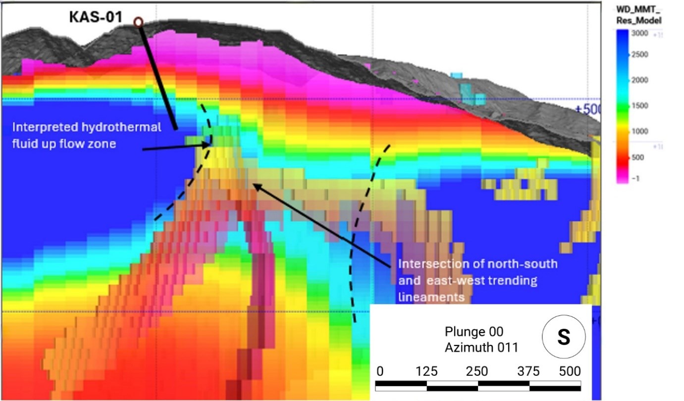 The first drill hole, KAS-01, has been collared within the highest-temperature portion of the advanced argillic assemblage. The hole is designed to test the interpreted intersection of two conductive lineaments, evaluate the margin of a moderately conductive "upflow" zone defined by resistivity inversion modelling, and assess vertical alteration zonation and sulphide development at depth.