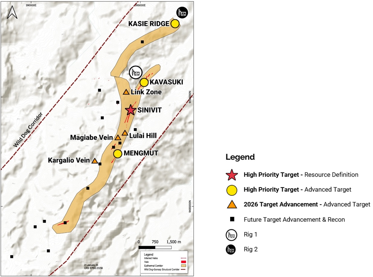 "Kasie Ridge is a very technically compelling target on the Wild Dog project. The scale of advanced argillic alteration, the presence of high-temperature minerals such as zunyite and diaspore, and the convergence of structural corridors into a coincident magnetic feature all point toward a robust hydrothermal centre. Lithocap systems are inherently high-risk, but they are also where many major high-sulphidation and porphyry discoveries originate. This drill program is about applying disciplined mineral systems thinking to test whether we are positioned above something significant," stated Callum Spink, VP Exploration. "Drilling with Rig #1 is also progressing well with a second hole underway at the Kavasuki target. Having two rigs turning full time will allow us to increase the pace of our exploration in 2026, as planned."