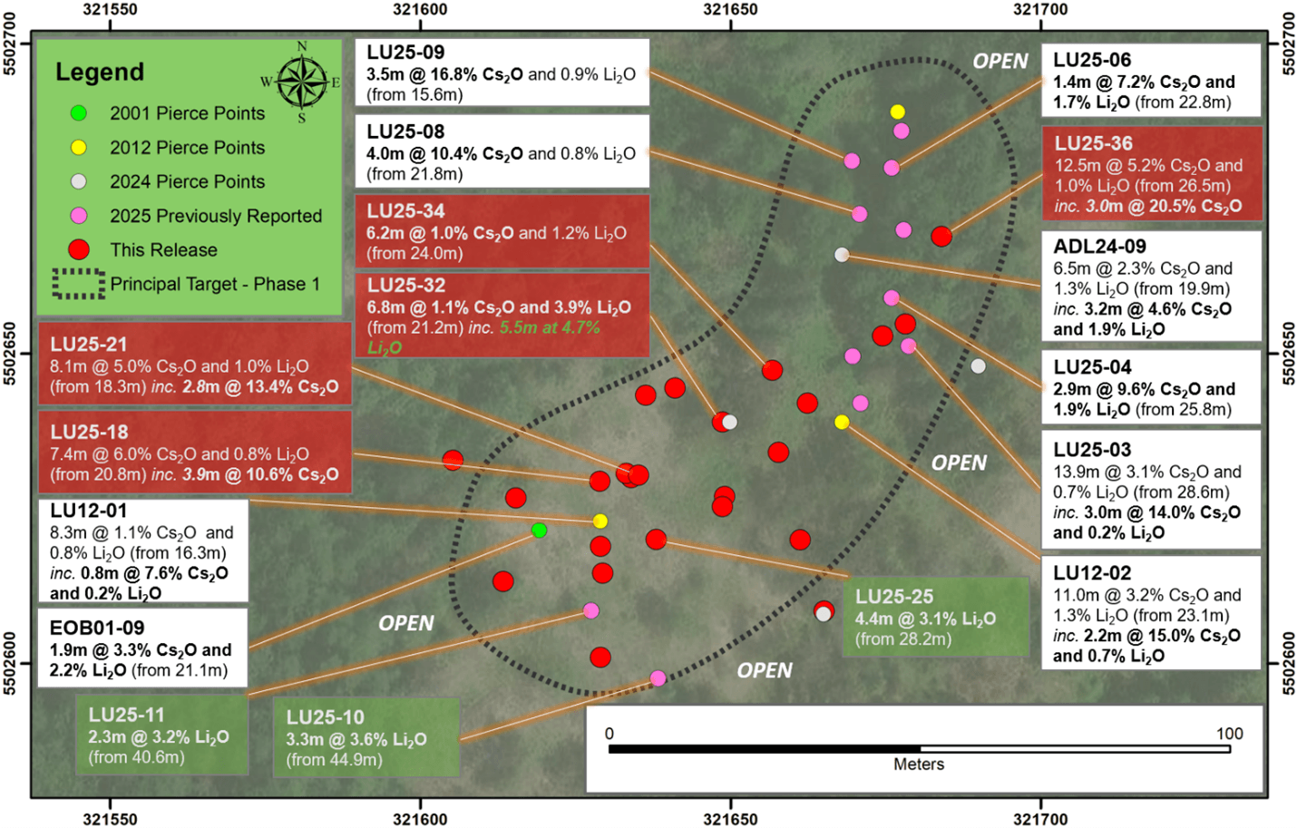 High-grade cesium intercepts from holes LU25-12 to LU25-39 (see Table 1) include: