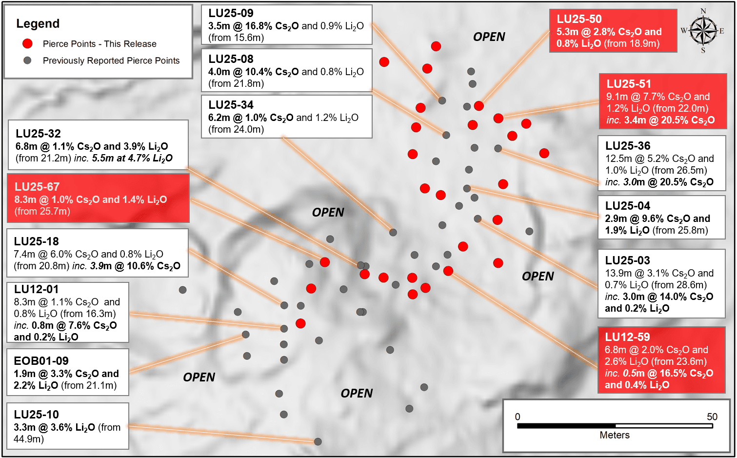 The best cesium intercept drilled at the Property to date was returned in hole LU25-51 of 3.35 m grading 20.45% Cs2O including 2.35 m with 28.4% Cs2O. Other highlights from the current batch of reported holes are shown in Table 1.