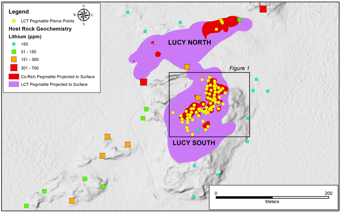 A total of 28 holes are reported in this release such that all 67 holes (3,035 metres) have now been reported from the Phase 1 cesium-focused drill program at Lucy South. Significant results include both cesium-rich and lithium-rich intersections hosted by the highly fractionated core zone of the host Lucy South pegmatite. All of the reported drillholes in the program have intercepted Lucy South at no greater than 50m vertical depth. The majority of cesium intercepts have occurred at a down hole depth of less than 30 meters.