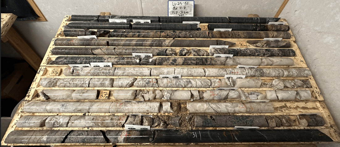 Figure 3: Drill hole LU25-51 showing core zone of pegmatite (in white) surrounded by host rock. Core grades of 3.35 m with 20.45% Cs2O (from 22.0 m) including 2.35 m with 28.4% Cs2O.