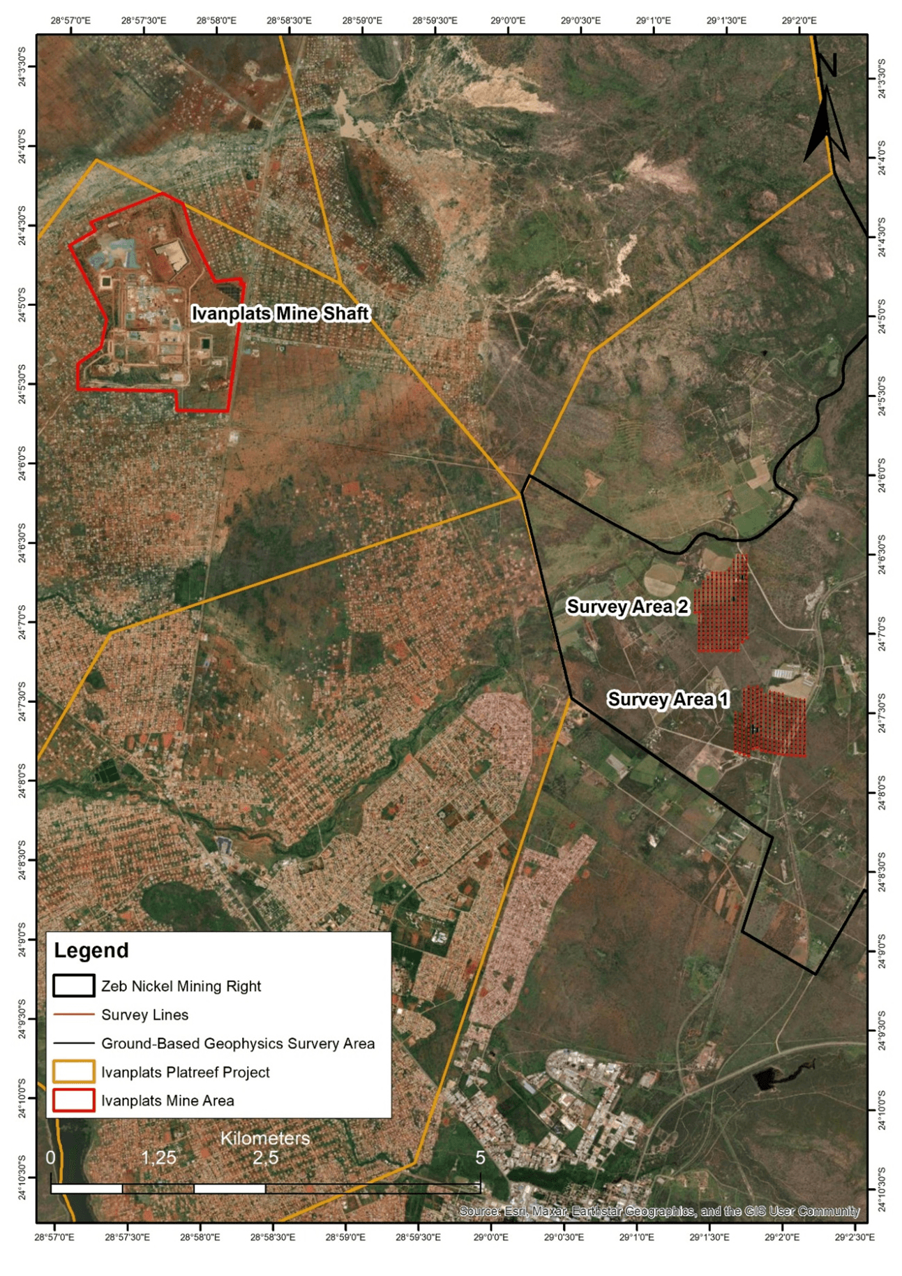 Figure 1: Map showing the ground-based geophysical survey areas, including the adjacent Ivanplats Mining Right and mine shaft. The gravity survey along the planned lines commenced on 15 April 2026.