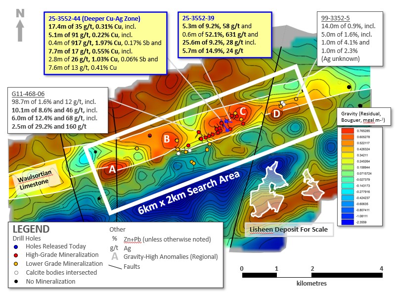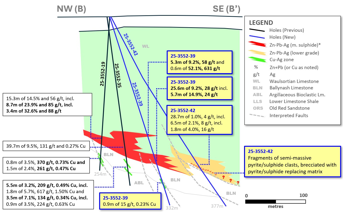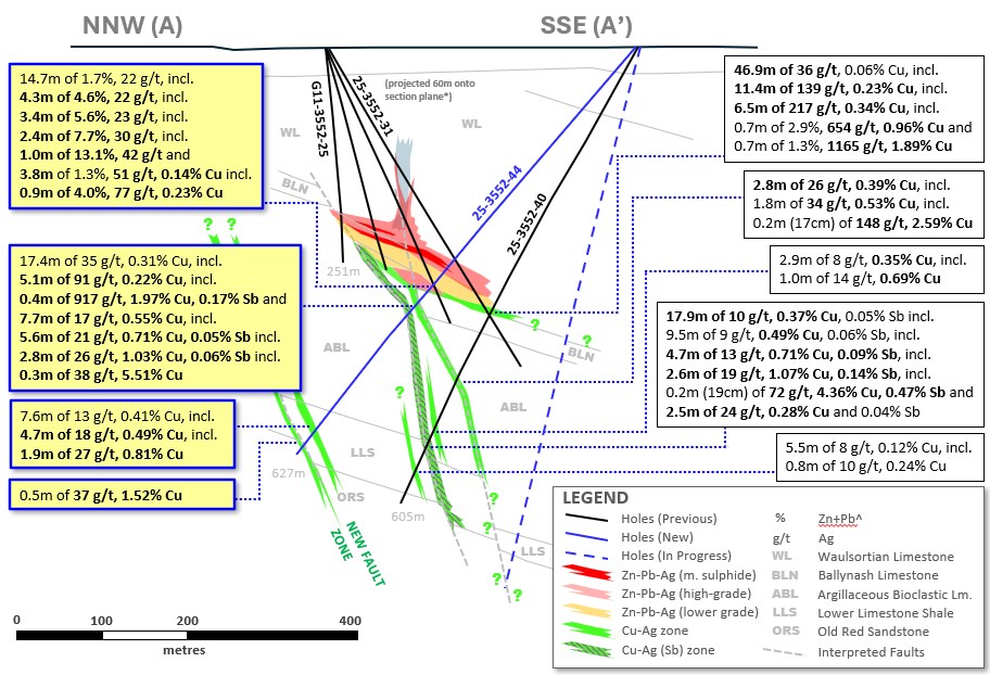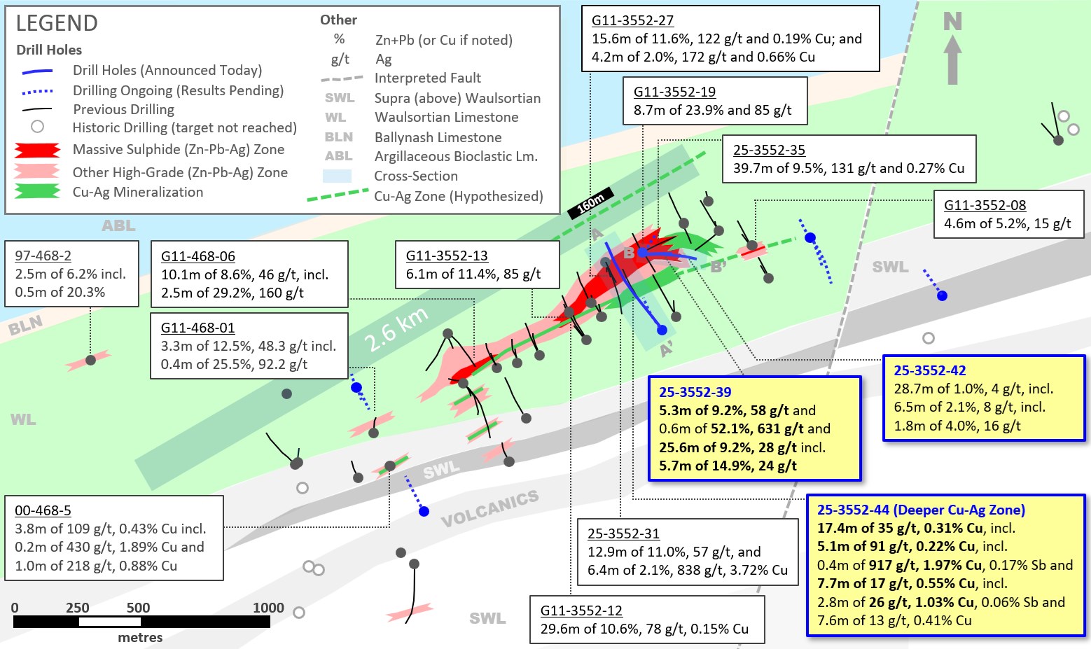 "Today's results are significant given they clearly show the presence of Cu-Ag mineralization associated with extensive, steeply dipping 'feeder' faults located immediately below the Zn-Pb-Ag horizon," stated Bart Jaworski, CEO. "Having both Zn-Pb-Ag and Cu-Ag zones in close proximity is a fortuitous situation from a future mining perspective, relative to our initial hypothesis of a flat lying Cu-Ag horizon occurring separately a couple of hundred metres below the Zn-Pb-Ag horizon. Also important is the discovery of a second fault at the bottom of 25-3552-44, suggesting a parallel mineralizing system immediately to the north of the discovery which has not yet been drilled. Lastly, we are very pleased to see one of the best intersections to date at Ballywire in step-out hole 25-3552-39, illustrating the strength of the mineralization system. We are poised to add further shareholder value via ongoing drill testing of the Zn-Pb-Ag horizon and associated Deeper Cu-Ag target along our 6km long prospective trend at Ballywire."