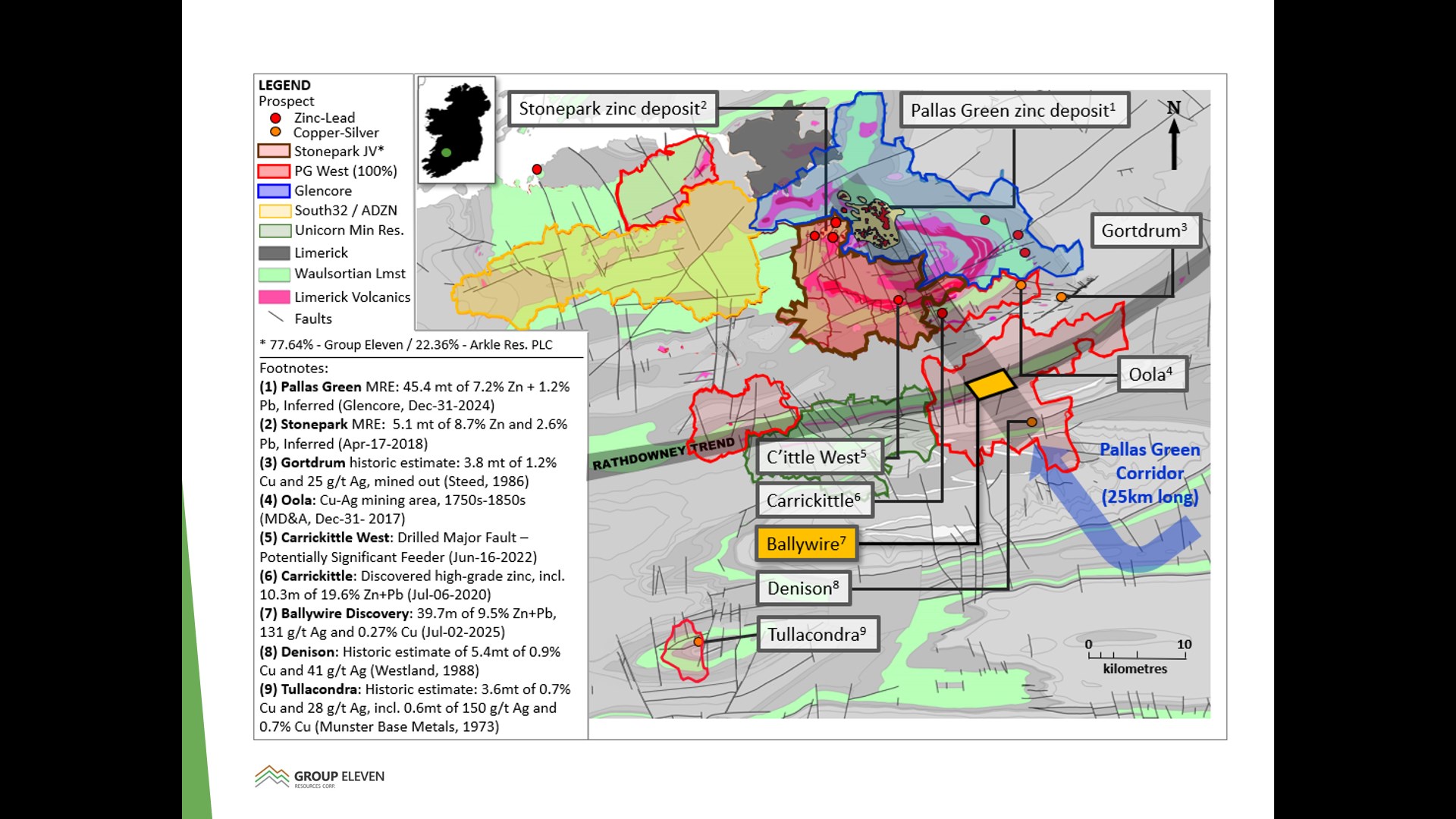 The Ballywire prospect at the Company's 100%-owned PG West Project in Republic of Ireland, represents the most significant mineral discovery in Ireland in over a decade. First announced in Sept-2022, the discovery has 62 holes drilled and reported by Group Eleven to date, including the most recent three holes (25-3552-39, -42 and -44) reported today (see Exhibits 1 to 6).
