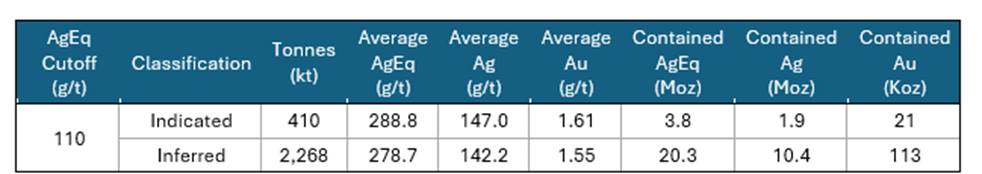 Inferred Mineral Resources increased by 630% relative to the previous historical Mineral Resource Estimate1,2 to 20.3 million silver-equivalent3 ("AgEq") ounces (oz), despite ongoing mining activities (2.27 million tonnes (Mt) @ 142.2 g/t silver (Ag) and 1.55 g/t gold (Au), containing 10.4 million ounces (Moz) Ag and 113 thousand ounces (Koz) Au).