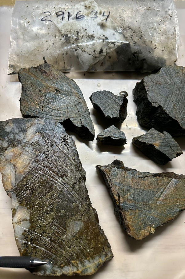 Broad zones of anomalous mineralization (>0.5 g/t Au) have been identified in quartz–carbonate–sulphide veining hosted within dominantly metavolcanic rocks and possible fine-grained gabbro sills, as reinterpreted from earlier mapping. Further work in 2026 will be required to confirm these lithological relationships.