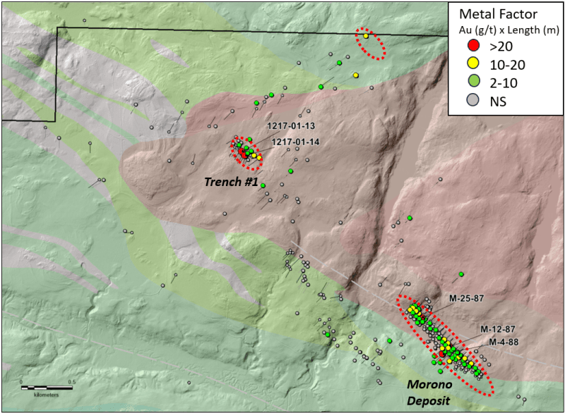 As a result of this new analytical perspective, multiple significant Au-Ag-Cu halos have been identified within several key target areas on the Mosseau Property. Critically, this allows the Company to narrow its focus to three principal areas of interest, including Trench #1, the Morono Gold Deposit, and what were thought to be isolated targets along the northern boundary of the property (see Figure 1, Figure 2).