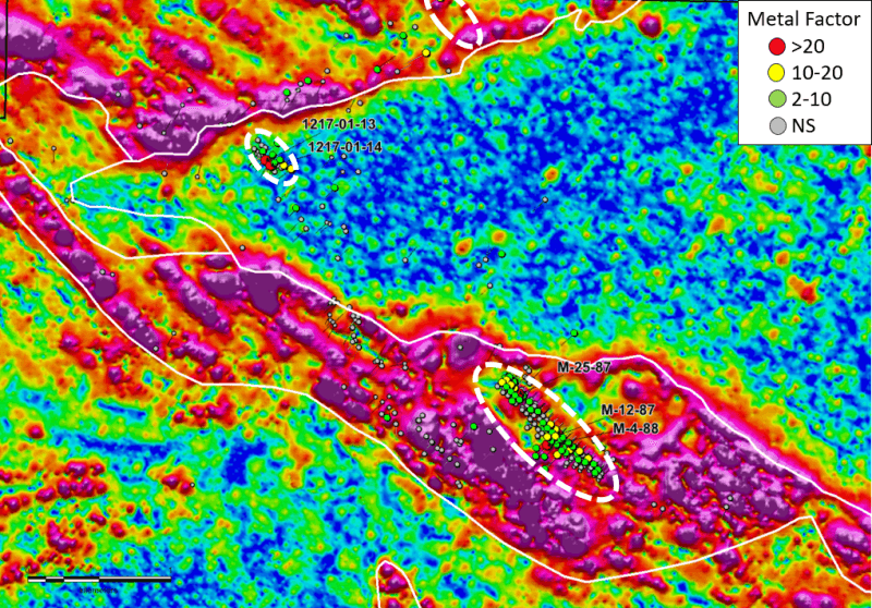 Figure 2: Northern part of Mosseau showing gold halos (metal factor) on magnetics