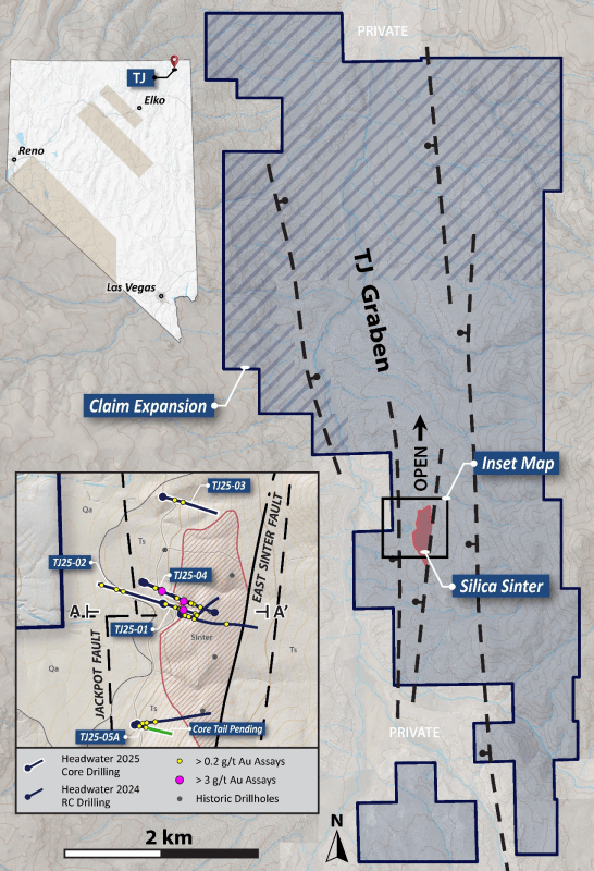 The TJ Project is located on Bureau of Land Management land in northeastern Nevada, approximately 25 km southeast of the town of Jackpot. The project hosts a laterally extensive silica sinter and a well-preserved low-sulfidation epithermal system associated with a graben structure filled with Miocene sedimentary rocks. Headwater completed initial RC drilling in 2024, confirming a large epithermal alteration system (see news release dated January 16, 2025). The 2025 core drilling program has now demonstrated that this system hosts high-grade epithermal vein mineralization at depth. The project consists of 251 unpatented mining claims (1,990 hectares) following the expansion announced herein. OceanaGold has satisfied the Minimum Commitment component of Stage 1 and continues to advance toward completion of Stage 1 which would require additional investment of approximately $8,000,000. Headwater holds an option to acquire a 100% undivided interest, subject to retained royalties and OceanaGold's option to earn up to 65% of the project following certain expenditures and delivery of a Pre-Feasibility Study within a designated time frame.