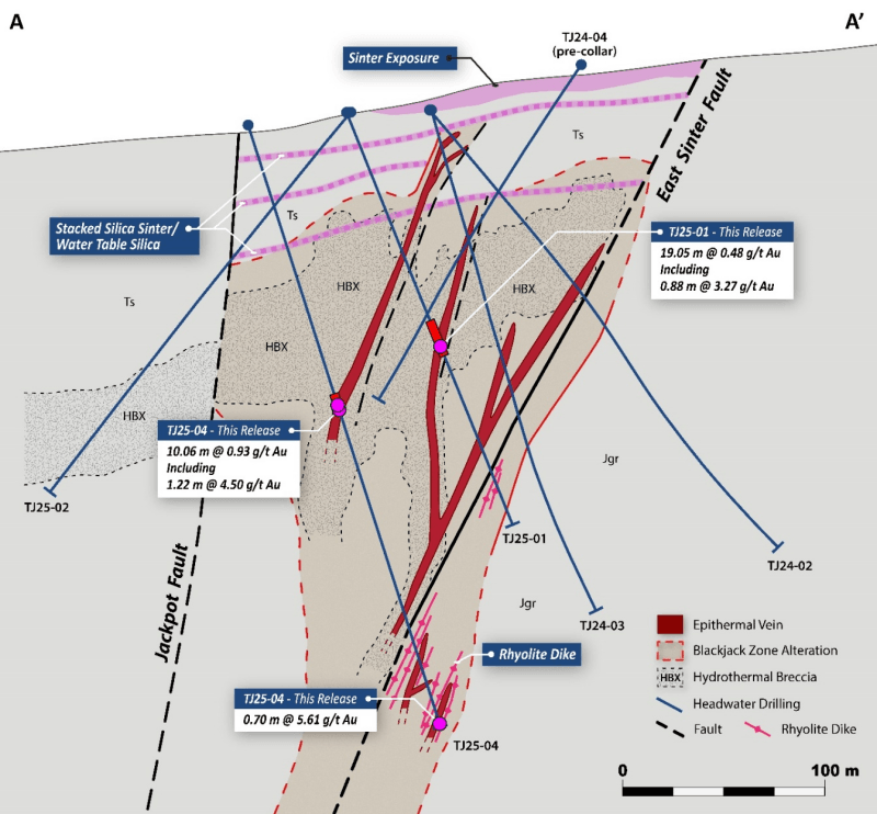 Figure 2: Interpretive geologic cross section A–A' showing results from 2025 Blackjack Zone drilling.