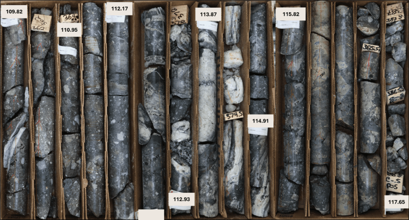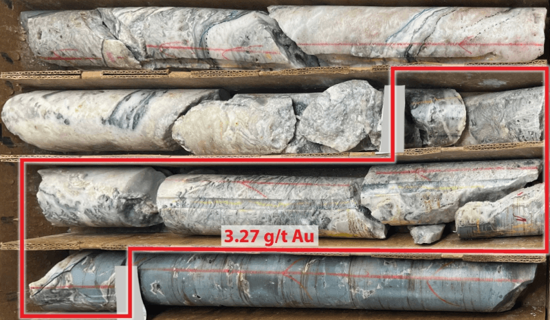 Figure 3: Photograph of 3.27 g/t Au over 0.88 m vein intercept in TJ25-01 showing abundant lattice-bladed quartz-after-calcite, vein sediments, and crustiform banding along the wall rock margins.