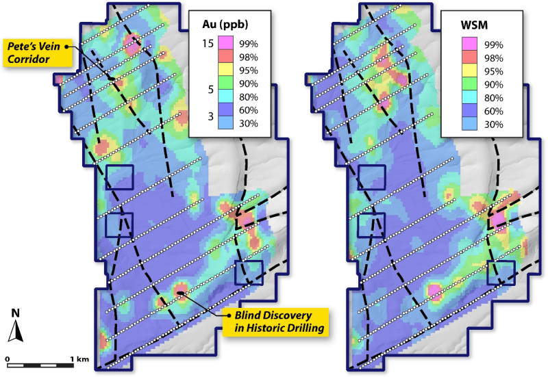 The soil survey, completed on 50-metre-spaced samples along broadly spaced orientation lines, highlights coherent pathfinder element anomalies that align with mapped northwest-trending structures and areas of silicification and clay alteration. These results provide important vectors for drill targeting, particularly where geochemical anomalies coincide with mapped or inferred structures, such as in the area of Pete's Vein in the northern project area.