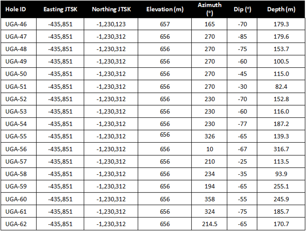 - The 113-126m zone in UGA-46 has now been determined to be included in a wider, higher grade zone of 33m @ 2.29g/t Au & 9.3g/t Ag from 99m (0.4g/t Au cut-off, downhole thickness), including: