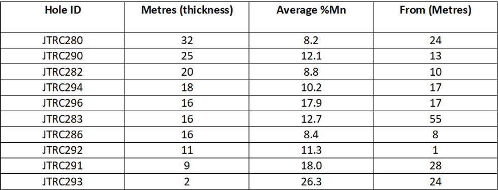 This third and final round of assay results reveal significant manganese intercepts near surface and extending to depth, as displayed in table A and illustrated in Figure 1. Full drill hole assays are displayed in Appendix 3.