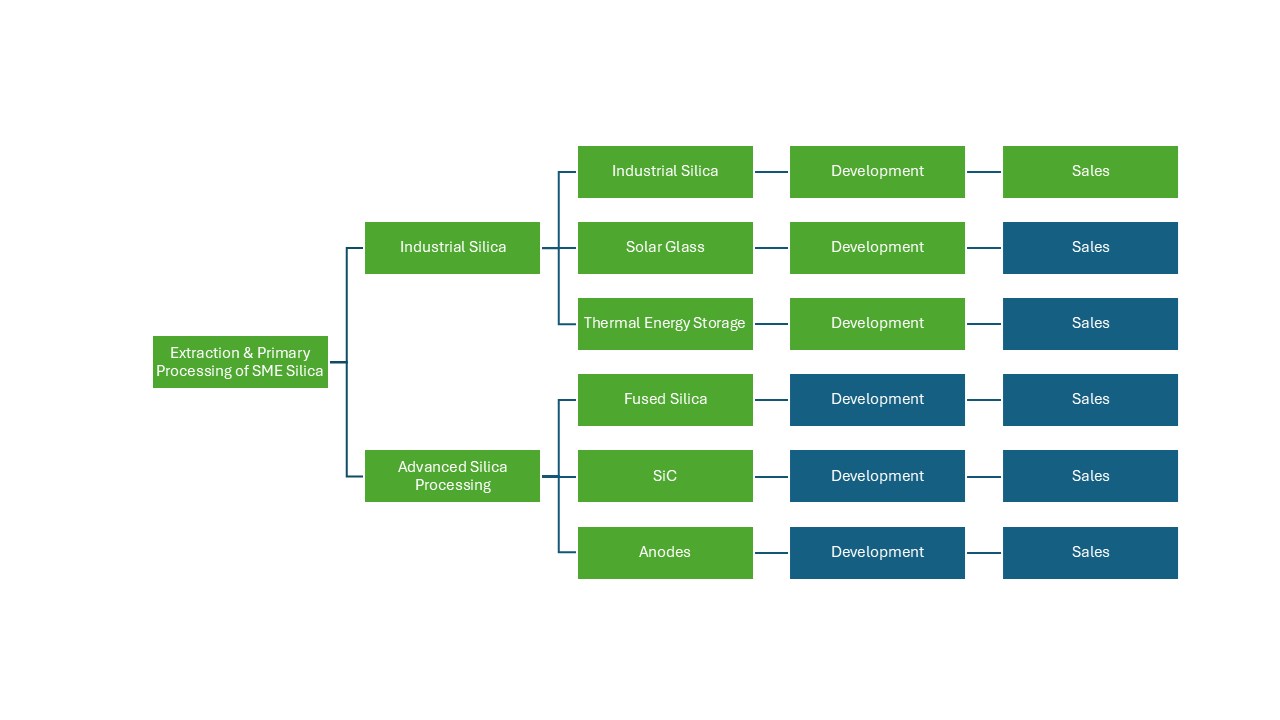 Figure 2. Homerun's silica value chain from extraction to advanced products, highlighting development and sales across each segment.