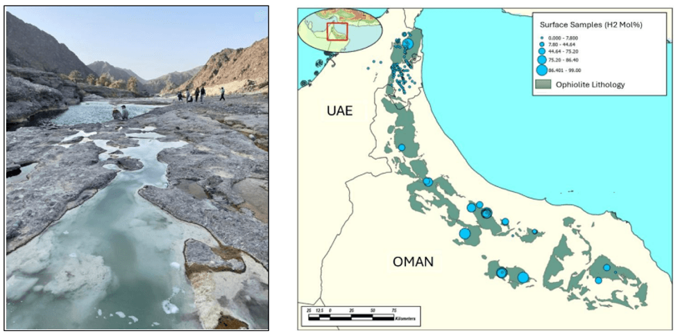 Oman is widely regarded in scientific literature as one of the most prospective countries in the Middle East for geologic hydrogen.3 The Semail Ophiolite, one of the world’s largest and best-exposed ophiolite complexes, consists of ultramafic mantle rocks that naturally generate hydrogen through reaction with water. This process, known as serpentinization, has been directly observed at surface, with hydrogen visibly bubbling from springs above the ophiolite (Figure 1). ARA and HyTerra's collaboration aims to move beyond surface observation to evaluate the subsurface system and define what it will take to bring that hydrogen potential to commercial reality.