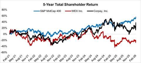 "As one of WEX's largest and most committed investors, Impactive is fully aligned with the success of the Company. This is why for the past four years we have repeatedly sought to engage constructively with the Board to help close the gap between WEX's intrinsic value and its stock price. Despite our best efforts, the Board has continued to dismiss our view that WEX's long-term owners deserve meaningful representation in the boardroom to hold management accountable and drive improved operating performance. Without oversight by shareholders, the outcomes have been both predictable and deeply disappointing, and the widening gap versus its closest peer, Corpay, Inc. (NYSE: CPAY), is increasingly alarming. Over the last five years, WEX has trailed Corpay by 58% and underperformed the S&P MidCap 400 by 76%. 1 More recently, over the past three years, it has underperformed Corpay by 81% and the S&P MidCap 400 by 52%. (See "5-Year Total Shareholder Return" Chart)
