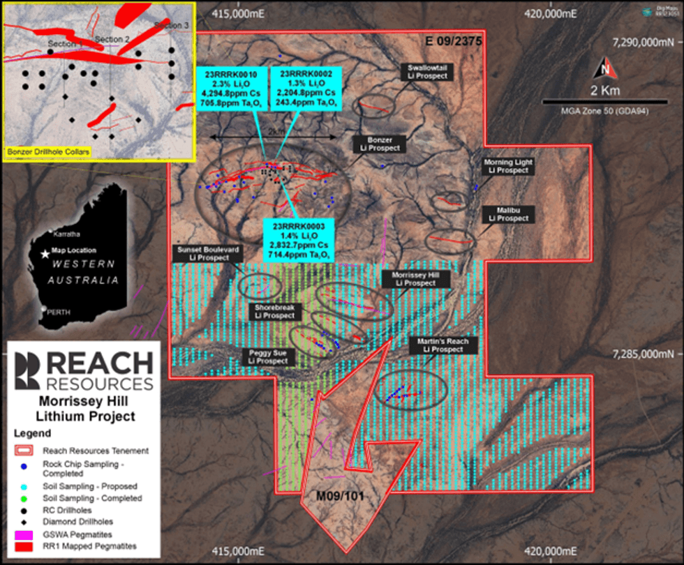 Reach Resources Limited (ASX: RR1 & RR1O) (“Reach” or “the Company”) is pleased to announce assay results from the Company’s maiden drill program at the Company’s 100% owned Morrissey Hill Lithium project in the Gascoyne Mineral Field W.A.