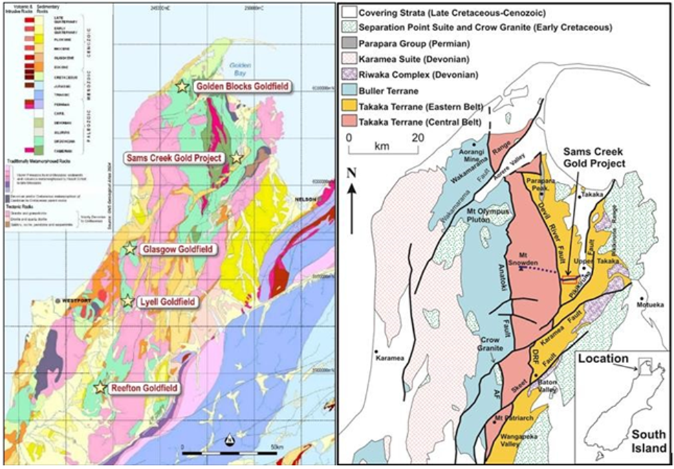 Western New Zealand was originally part of Gondwana and lay adjacent to eastern Australia until around 80 Ma ago. The NW of the South Island of New Zealand comprises an area of predominantly early Paleozoic rocks in broad northerly trending belts which terminate at the Alpine Fault (Figure 1). The Paleozoic sequence is divided into the Buller Terrane, Takaka Central and Takaka Eastern Belts. These belts are interpreted to correspond with the Western, Central and Eastern belts of the Lachlan Fold Belt. The Buller and Western Lachlan belts contain the orogenic gold deposits like Bendigo, Ballarat and Fosterville in Australia and the Reefton and Lyell Goldfields in New Zealand.