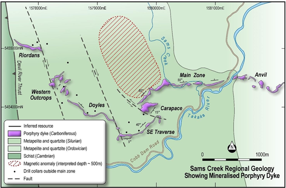 The Sams Creek porphyry dyke (SCD) is located in the Eastern Takaka Terrane, which is equivalent to the Eastern Lachlan belt that hosts porphyry copper-gold deposits like Cadia and Ridgeway.
