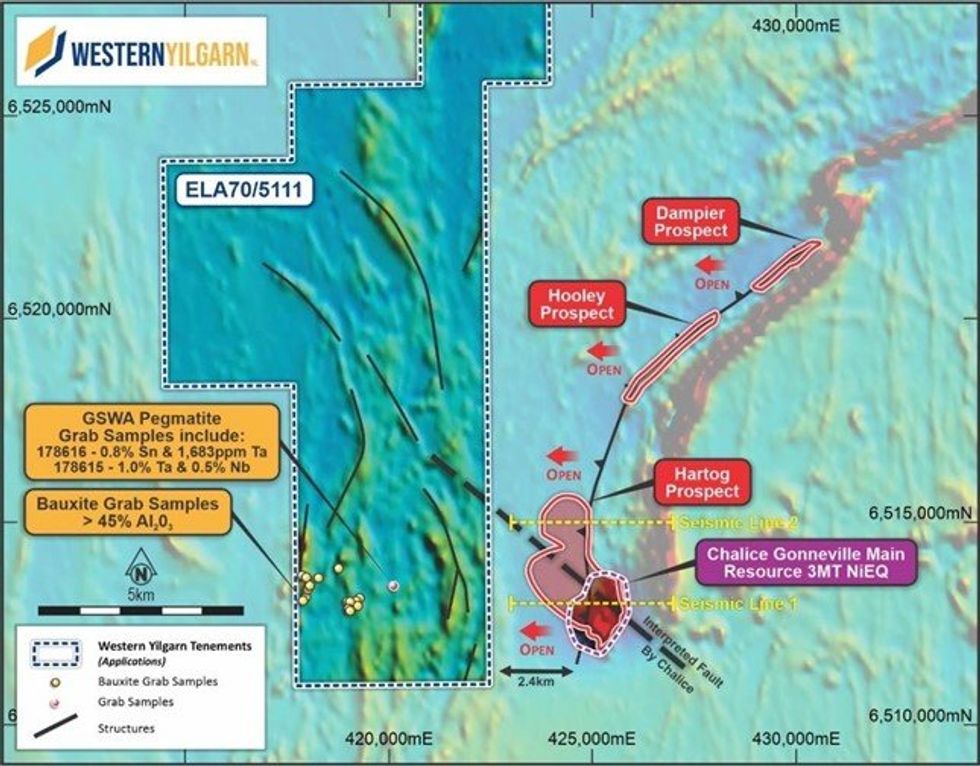 Western Yilgarn NL (ASX: WYX) (“Western Yilgarn” or “the Company”) is pleased to provide an update on developments relating to its 100% owned Julimar West Project (ELA 70/5111), located adjacent to Chalice Mining’s (ASX: CHN) Julimar Project in Western Australia. The Julimar Project contains the world-class 3MT NiEq Gonneville Resource (CHN ASX Announcement 31 July 2023) (Figure 2) and is located in a Tier 1 mining region.