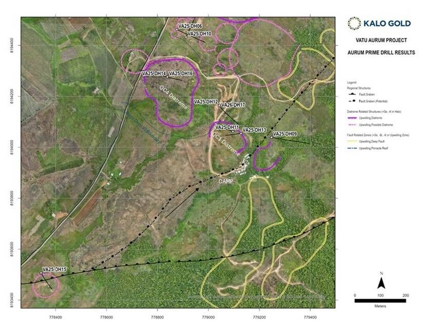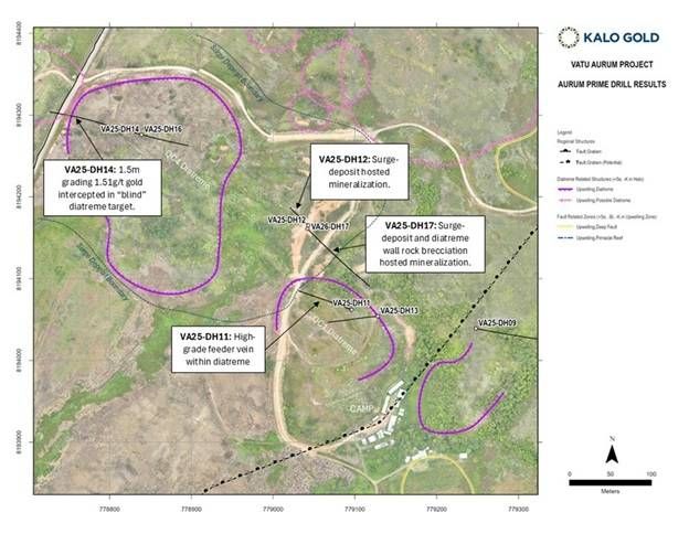 VANCOUVER, BC / ACCESS Newswire / April 8, 2026 / Kalo Gold Corp. (TSXV:KALO)(OTCID:KLGDF)(FSE:9M51) ("Kalo" or the "Company") reports drill results from VA26-DH17 at the QC1 target within the Qiriyaga Complex, confirming a vertically continuous gold system from surface through to the diatreme. The hole intersected 16.90 m at 3.25 g/t Au within a continuous mineralized profile spanning surge deposits, diatreme-margin breccias, and internal veining. Importantly, the interpreted primary epithermal feeder zone at approximately 395 metres depth - defined by the convergence of the Namalau, Loma, and Buca Faults - remains untested and represents a high-priority drill target.