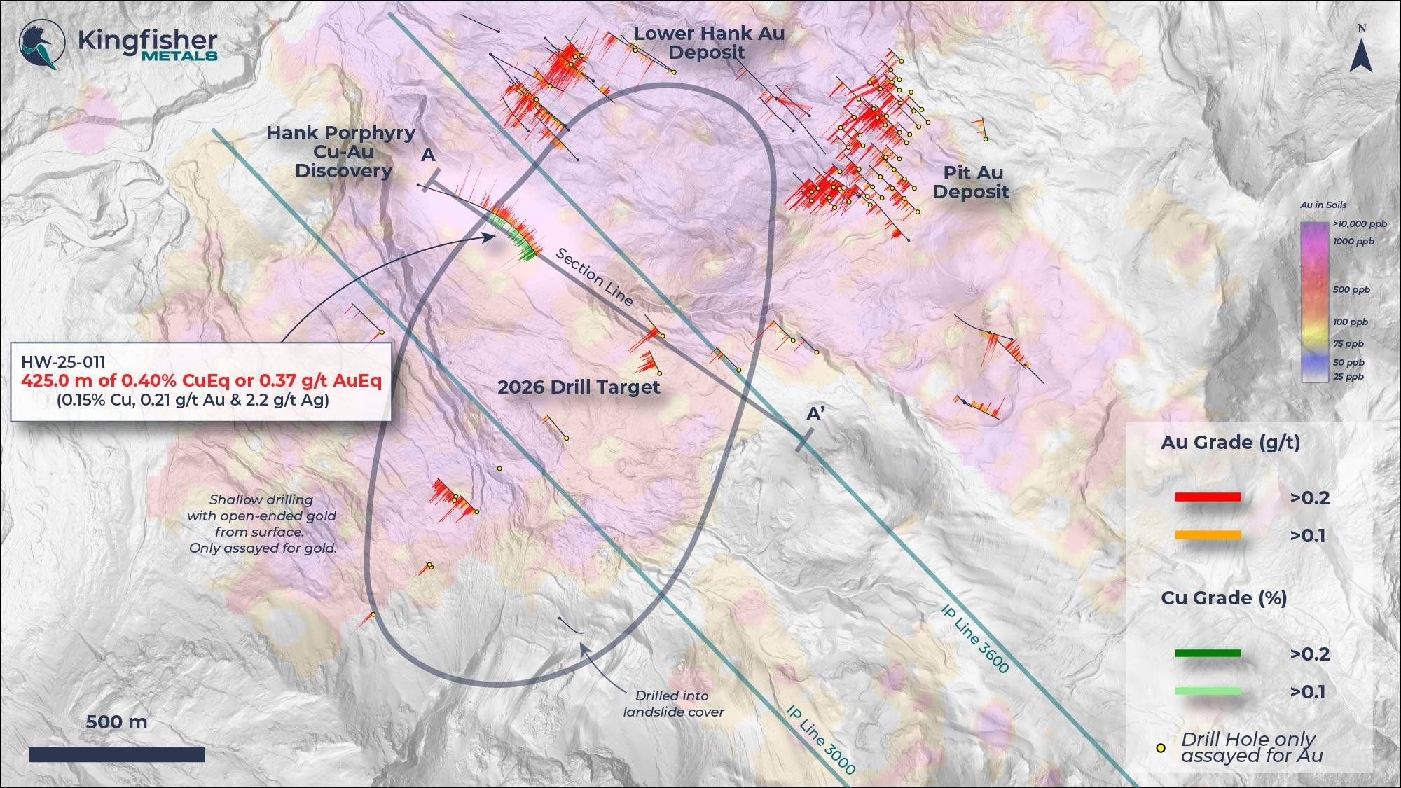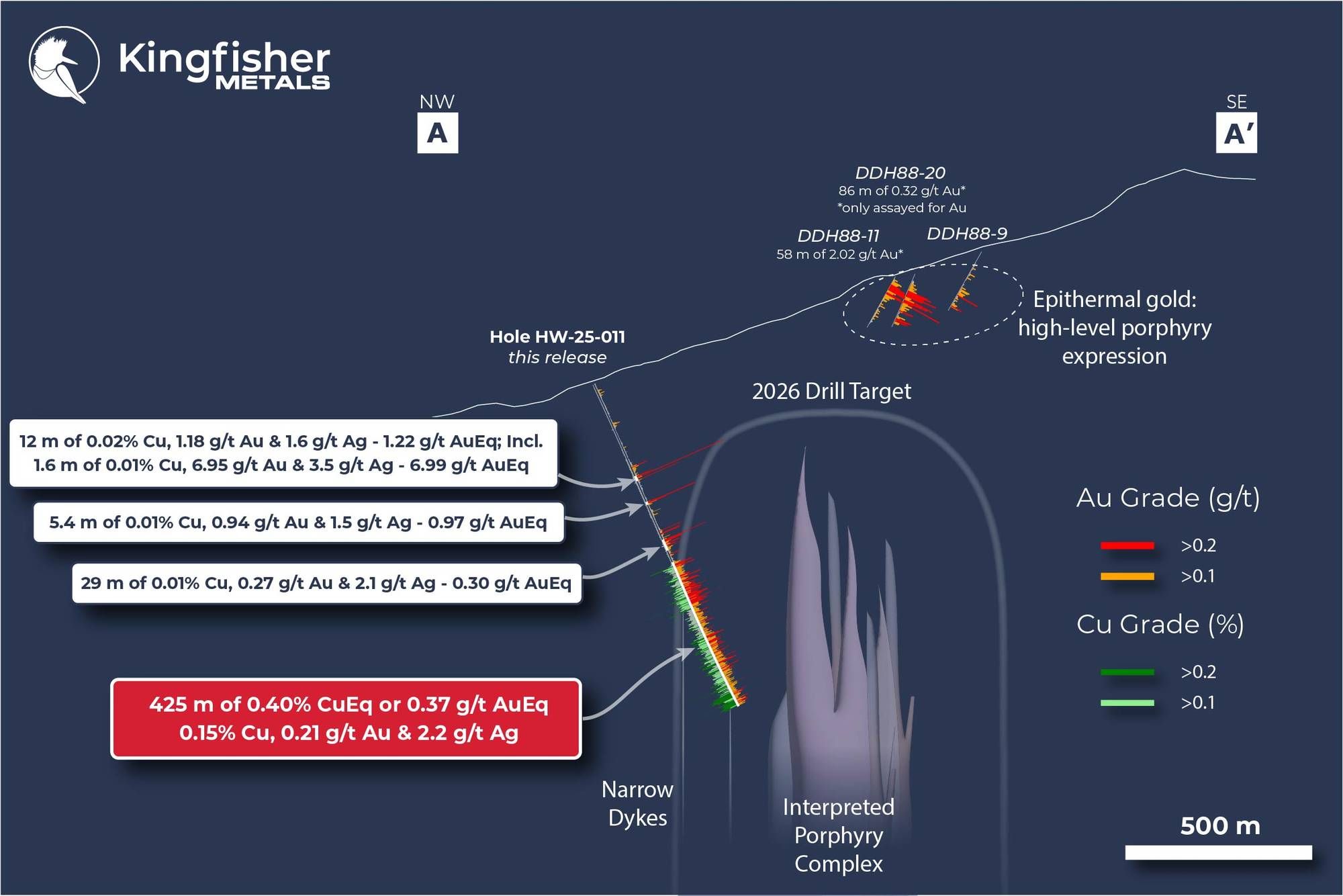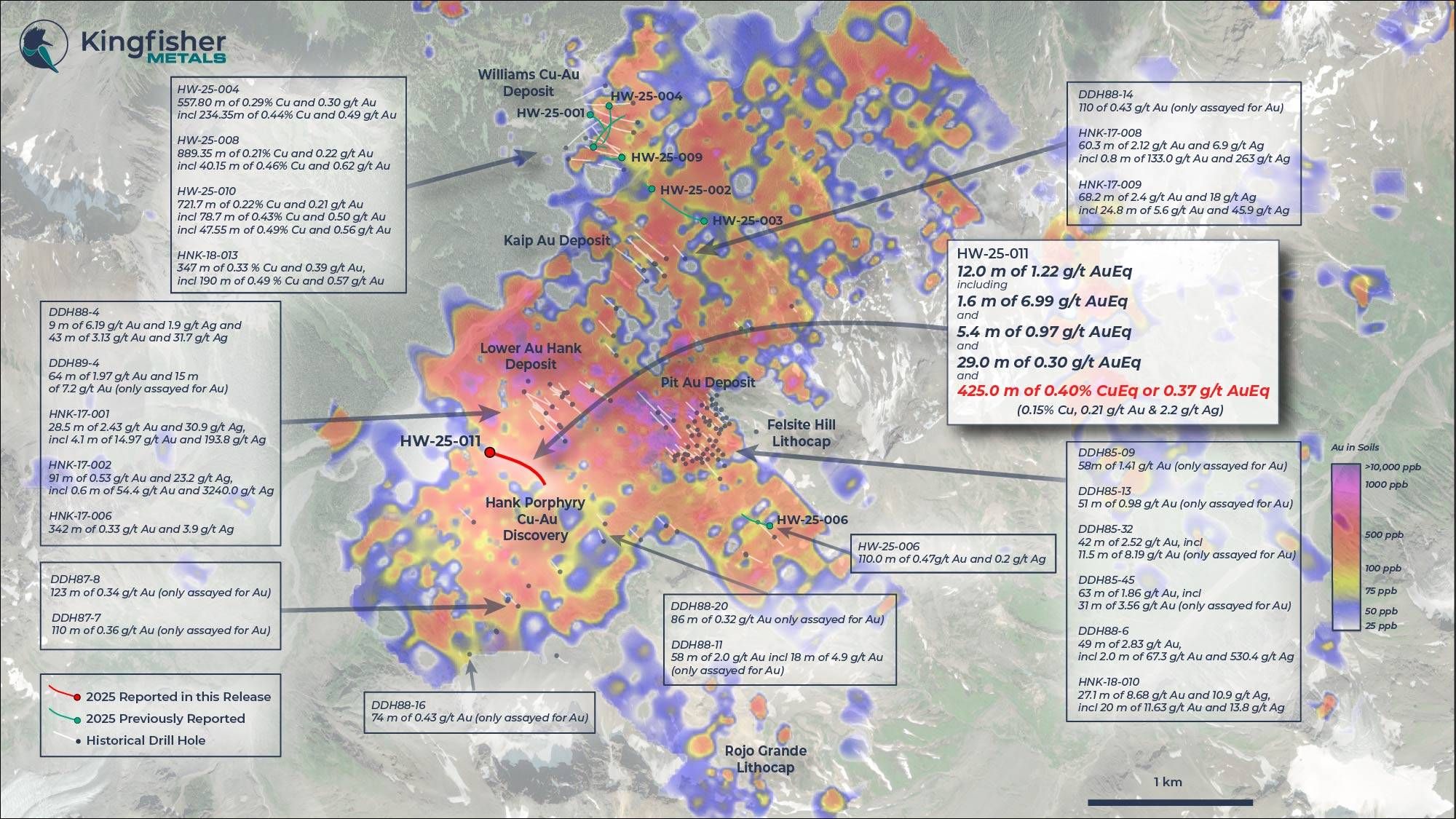 Drillhole HW-25-011 confirms discovery of a new copper - gold (Cu-Au) porphyry system below the Hank epithermal gold-silver (Au-Ag) mineralized system. Assays from HW-25-011 returned 425.0 meters1 (m) of 0.40% CuEq2 (0.15% Cu, 0.21 g/t Au and 2.2 g/t Ag) (Figure 1 - 5). This newly identified zone represents a blind discovery, as porphyry Cu-Au mineralization had not previously been recognized or reported at Hank. These results validate Kingfisher's exploration model and demonstrate the potential for the Hank area to host one or more large-scale porphyry Cu-Au systems.
