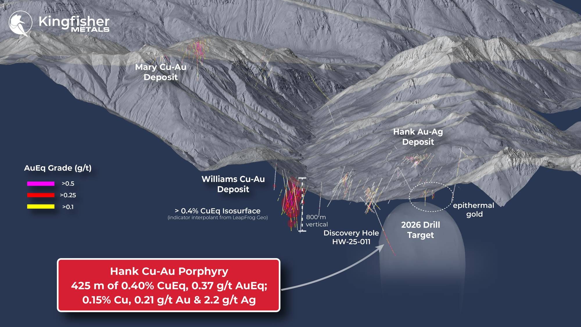 Dustin Perry, CEO of Kingfisher, states, "The final hole of the 2025 program validates our long-standing belief that the shallow Hank Au-Ag epithermal mineralization is driven by a large porphyry Cu-Au system. This impressive first intercept of 425.0 metres of 0.40% CuEq is interpreted to be on the margin of the system, with anticipated increases in grade toward the conceptual core. The scale and consistency of this discovery, along with a wide untested area hosting strong geophysical anomalies, highlight the potential for further exploration and support the need for aggressive follow-up drilling in 2026."