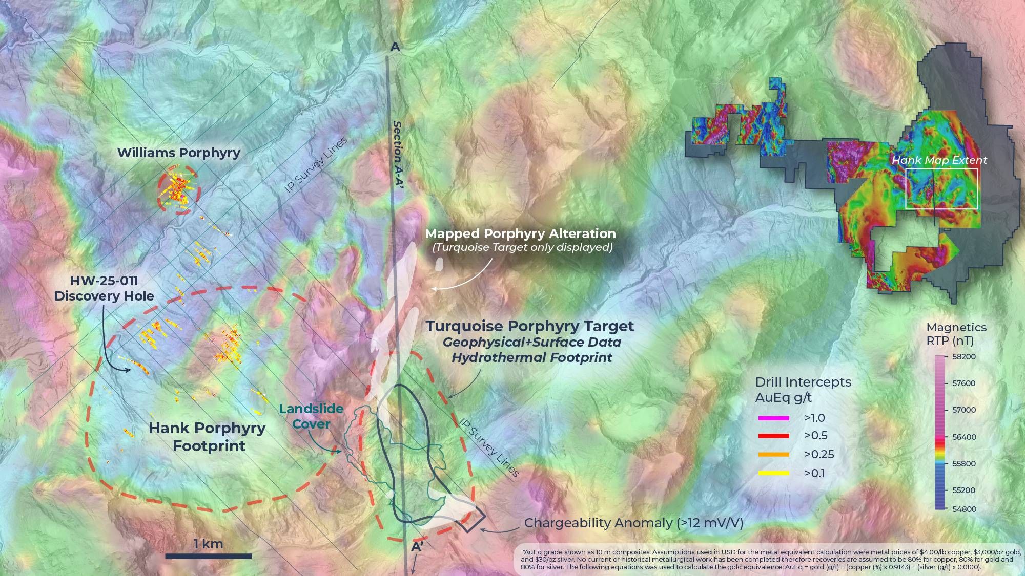 A new porphyry target has been identified ~3.4 km east of the Hank Porphyry discovery hole (HW-25-011). The target is centered on a 0.5 by 2.0 km chargeability anomaly (> 12.0 mV/V) and is supported by the recent MMT inversion, and magnetic inversion products1. Geophysical patterns define a possible fluid upwelling or structural root to the anomaly, supported by coincident geophysical signatures and surface geology mapping. The scale of the target area is approximately 1 by 3.4 km, elongated to the northeast.