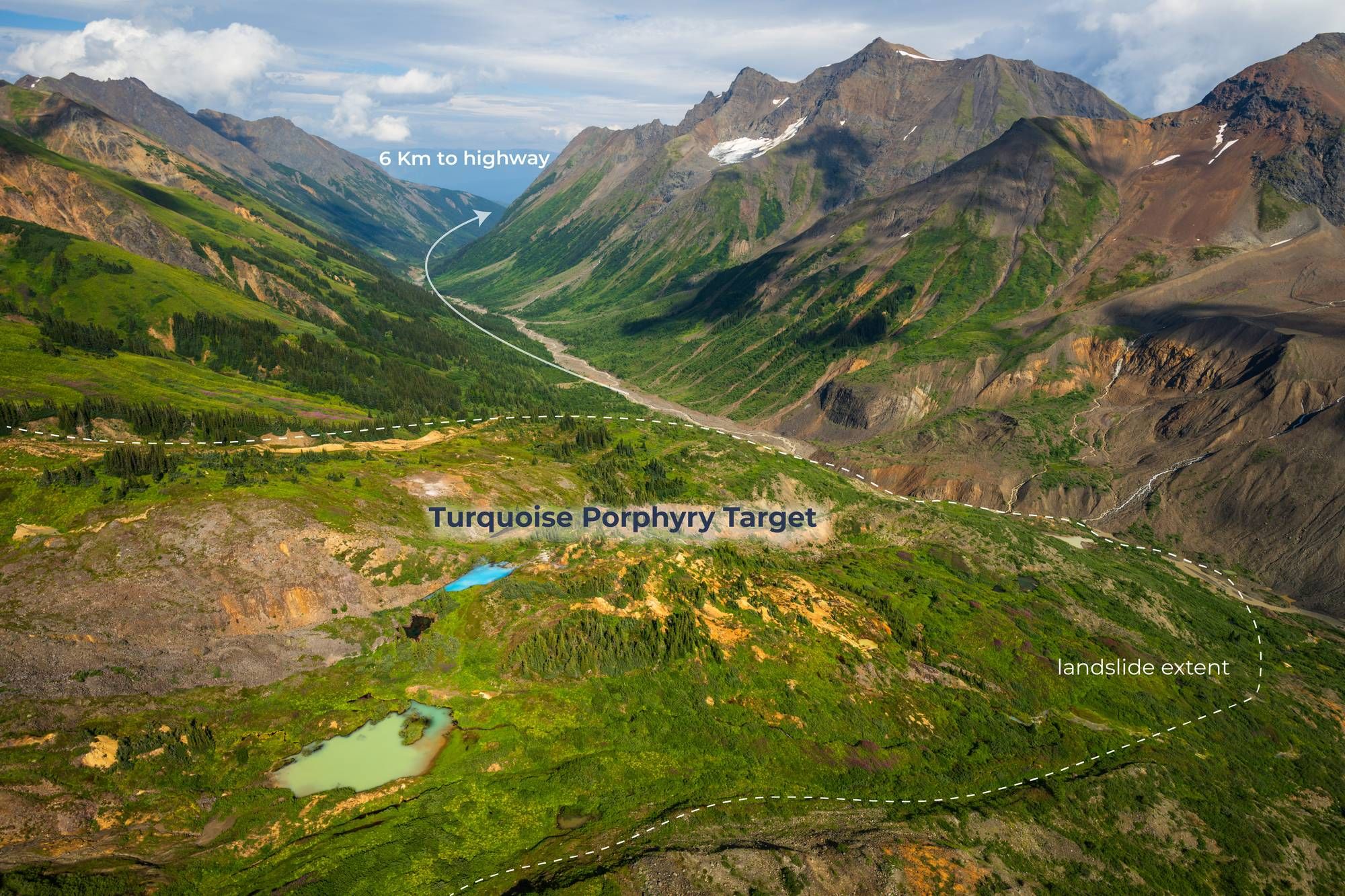 Majority of target area is covered by a landslide and glacial till, interpreted to cover the core porphyry alteration target with only discrete lateral alteration expressions at surface (Figure 1).