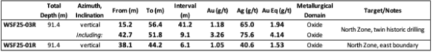 WSF25-03R: 41.2 metres (15.2 - 56.4m) grading 1.94 g/t Au Eqincluding 9.1 metres (42.7 - 51.8m) grading 4.14 g/t Au Eq: A shallow intercept of oxide gold and silver mineralization with a high-grade core: 4.14 g/t Au Eq.