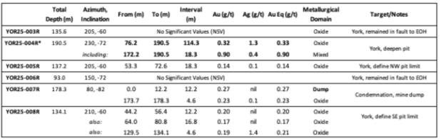The Company has also received analytical results for the final five RC drill holes completed at the York deposit, part of the Company's Santa Fe Mine project. Two of the drill holes were lost in a fault zone and therefore abandoned due to difficult drilling conditions (YOR25-003R and -006R), while two of the remaining three holes specifically targeted the margins of the York system for use in mine planning and to determine the potential margins of a future open pit (YOR25-005R and -008R, please see below).