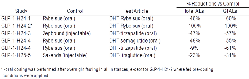 Over the course of now five human studies in GLP-1, we have evidenced that our DHT technology improves the ways in which active pharmaceutical ingredients enter the bloodstream, allowing for greater effectiveness, and reduced side effects consistent with our corporate mission. To that end, I'm compelled to summarize and share with you the dramatic impact that DHT has had on reducing the occurrence of AEs across these five human studies: