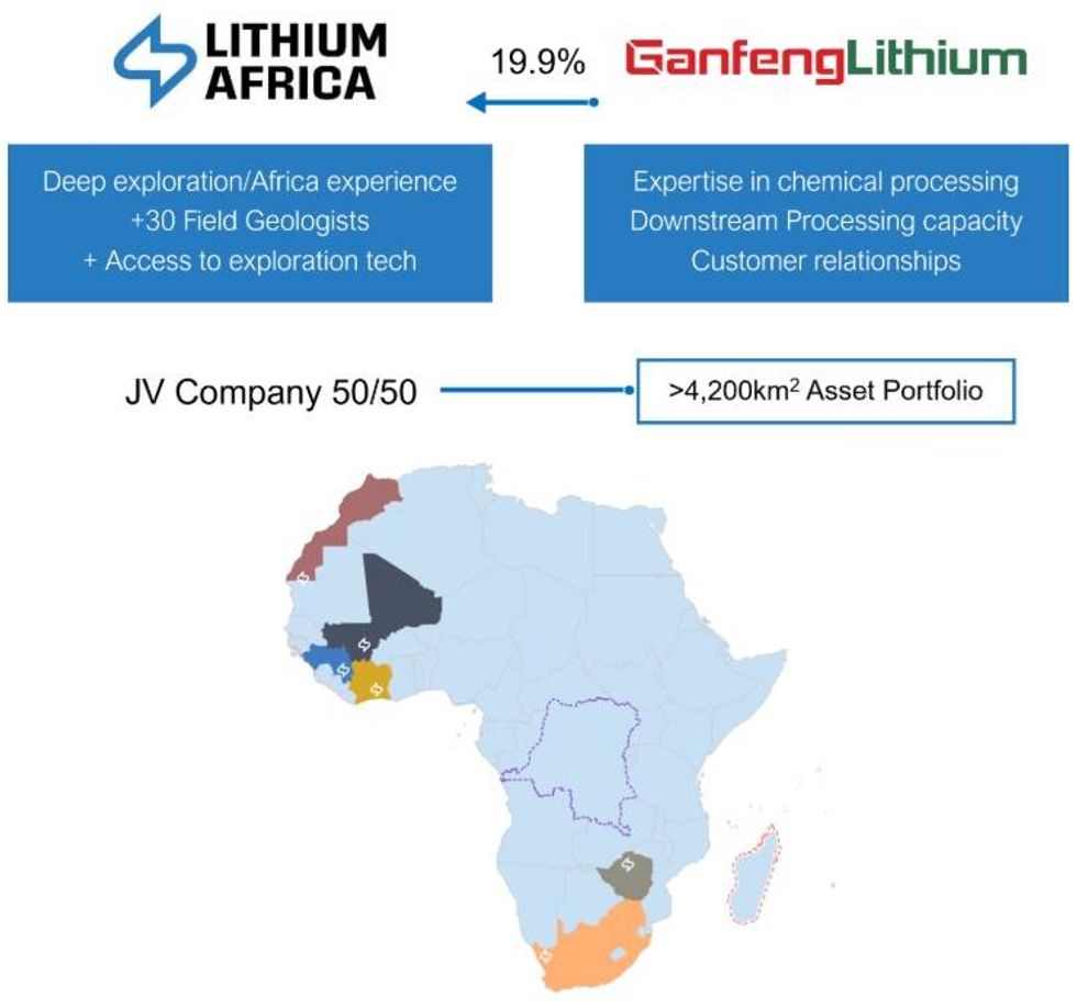 - Unique JV Model with Ganfeng Lithium: A new paradigm for exploration. Lithium Africa's 50/50 joint venture with Ganfeng Lithium doubles exploration spending, minimizes dilution and provides direct access to world-class processing expertise and long-term downstream offtake capacity.