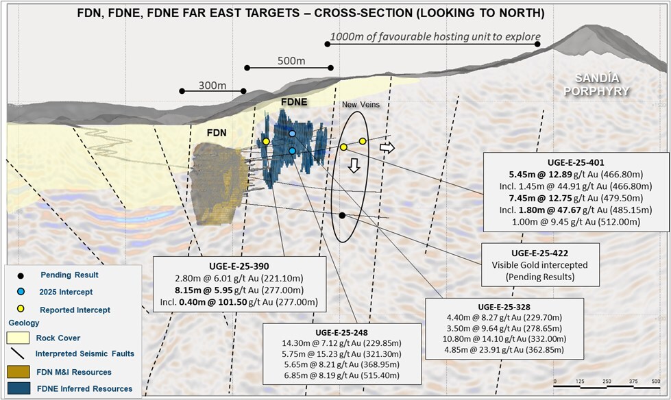 Exploration drilling at FDNS has focused on its Northern and Southern Extensions. The exploratory hole UGE-S-25-395 (15.32 g/t Au over 3.70m; 18.44 g/t over 3.40m; 11.08 g/t Au over 3.55m) intercepted several mineralized veins and indicated areas for further expansion to the North. To the south, exploratory hole UGE-S25-384 (91.32 g/t Au over 20.65m) delivered a remarkable intercept, indicating the presence of additional veins that warrant follow-up drilling. Two rigs are currently active at FDNS, and full assay results are provided in Table 1.